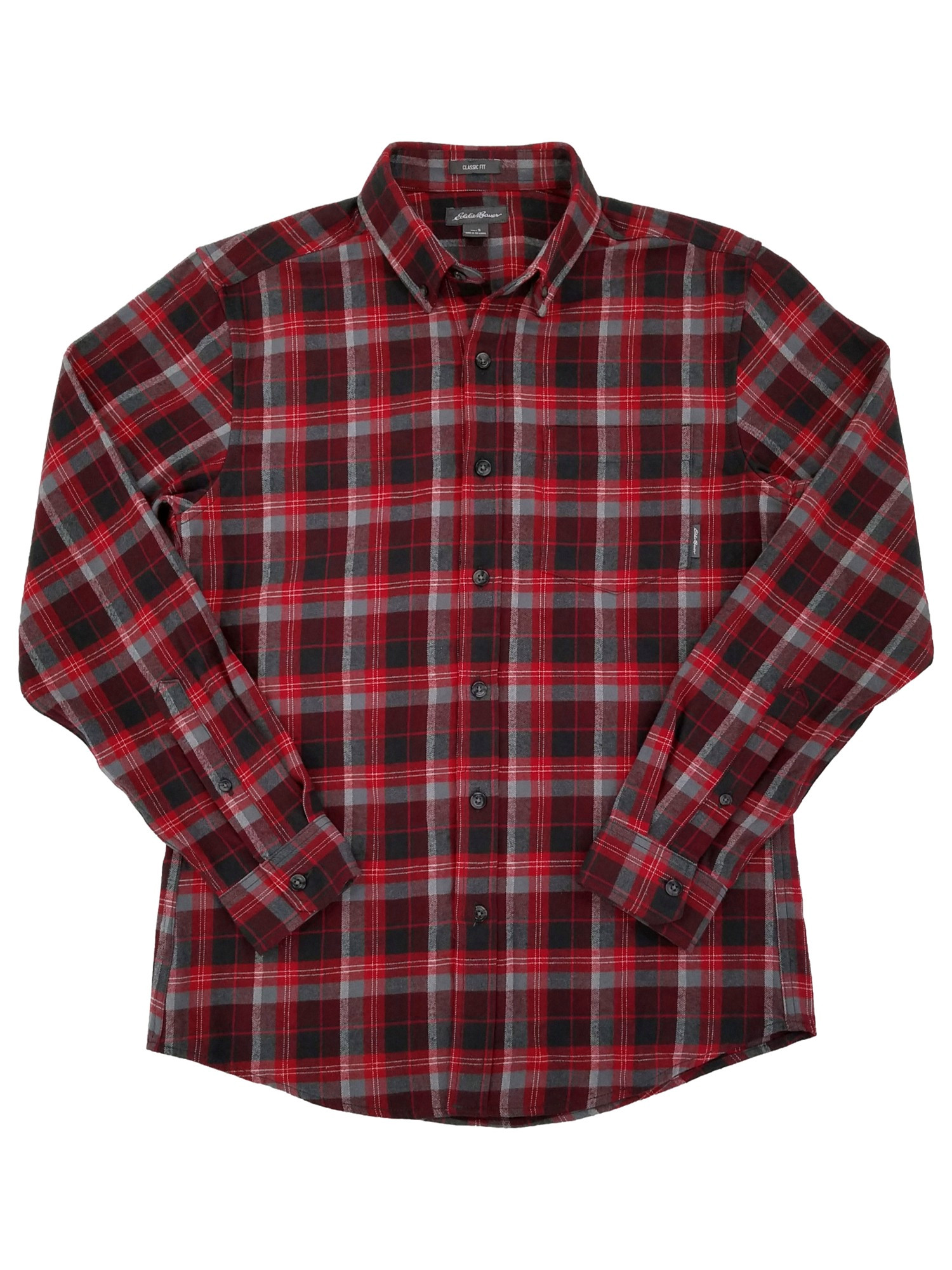 Eddie Bauer Mens Red Black Gray Plaid Classic Fit Long Sleeve Flannel Shirt S